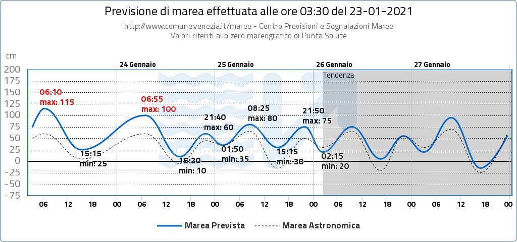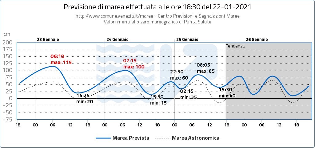 L’attento e continuo monitoraggio delle condizioni meteo marine prevedono un possibile evento di alta marea con colmo a Chioggia alle 10.10 di domani, venerdì 29 gennaio 2021, e a Venezia alle 10.40. Si segnala perciò un possibile sollevamento delle barriere del sistema Mo.S.E. alle 8.00 di domani con avvio dell’abbattimento delle barriere previsto domani alle 12 e riapertura dei canali alle 14.00.