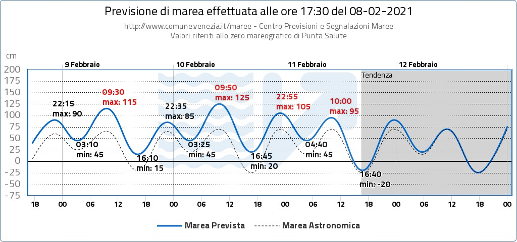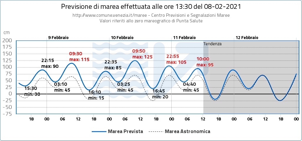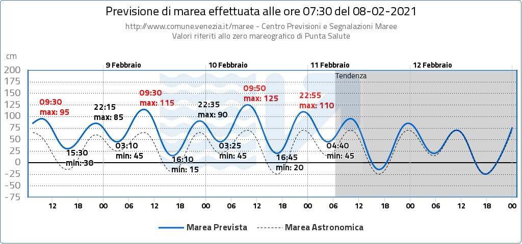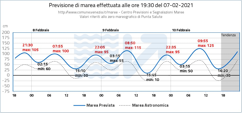 Le condizioni meteo marine prevedono un possibile evento di alta marea con colmo a Chioggia alle ore 9.50 e a Venezia alle ore 10.20 del 10 Febbraio 2021. Si segnala perciò un possibile sollevamento delle barriere del sistema Mo.S.E. alle ore 4.50 alla barriera di Lido, alle ore 5.25 alla barriera di Chioggia, alle ore 6.30 alla barriera di Malamocco del 10 Febbraio 2021, con avvio dell’abbattimento delle barriere previsto alle ore 11.50 e riapertura dei canali alle ore 13.50.